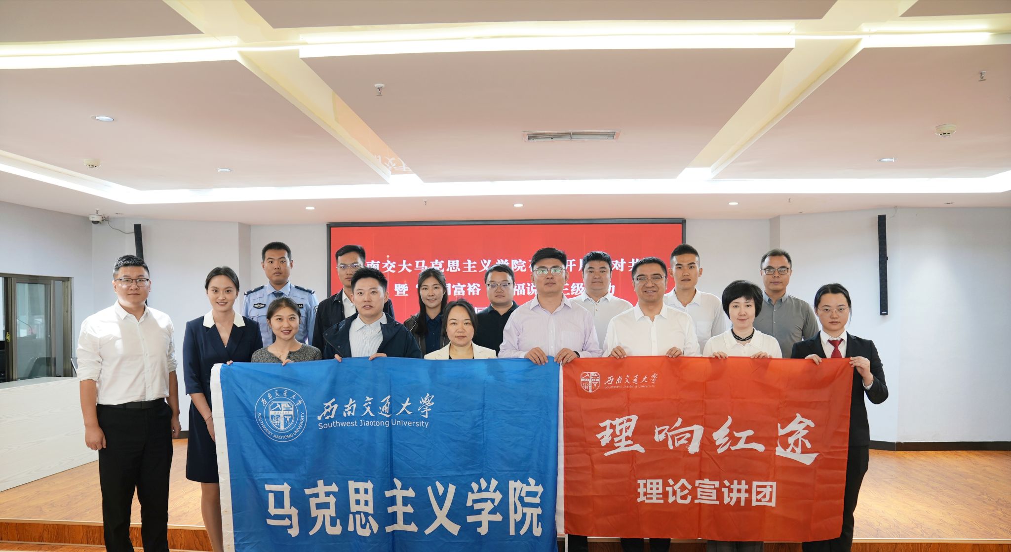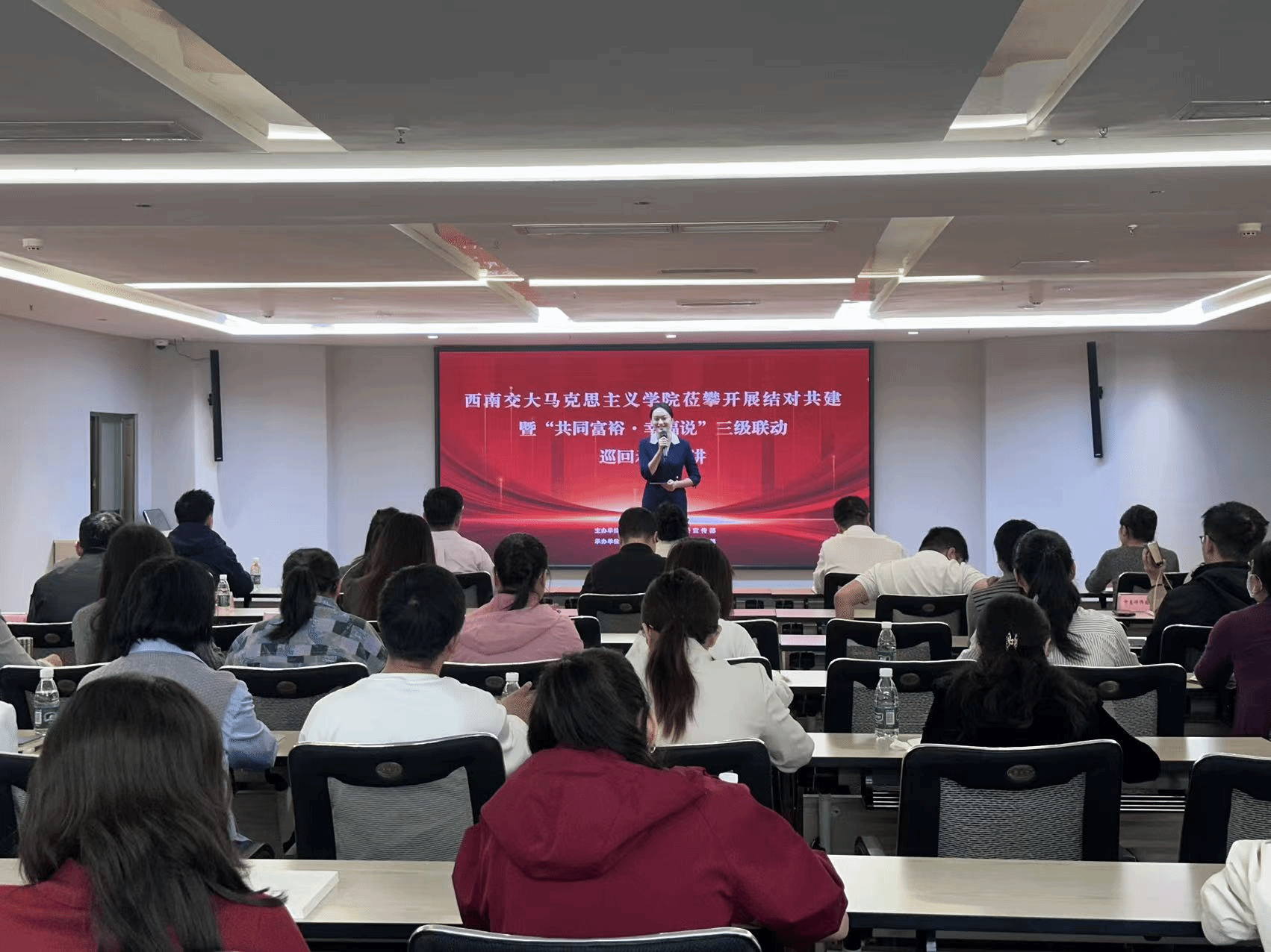 为推动高校优质理论资源下沉基层,促进党的创新理论在攀枝花落地生根、开花结果,10月31日下午,av影片直播一行走进攀枝花市仁和区新时代文明实践中心,开展结对共建暨“共同富裕·幸福说”三级联动巡回宣讲活动。活动涵盖理论宣讲、座谈交流和基地共建等内容。av影片直播副院长王菁、形势与政策教研部主任马先睿,以及西南交通大学“理响红途”理论宣讲团、仁和区“仁人论理”基层宣讲团、“攀谈说理”宣讲团等代表共同参与。